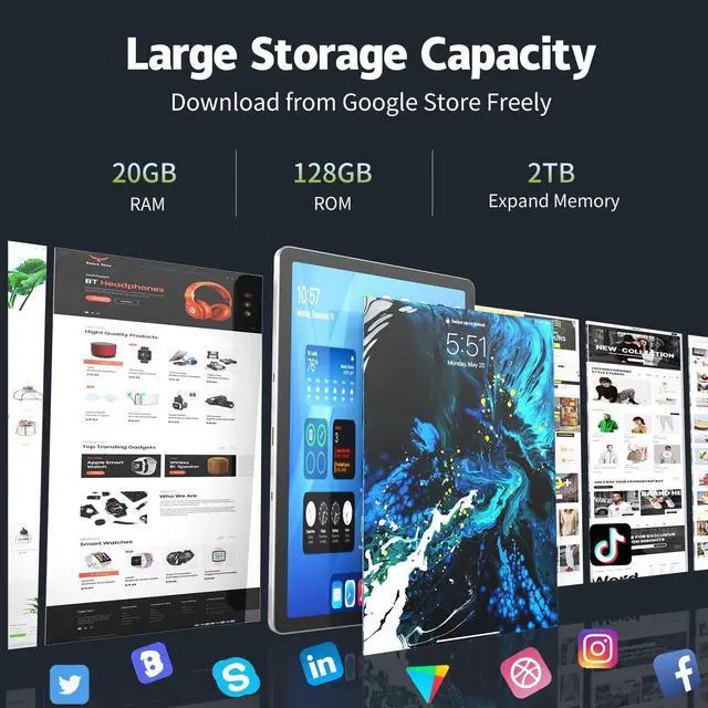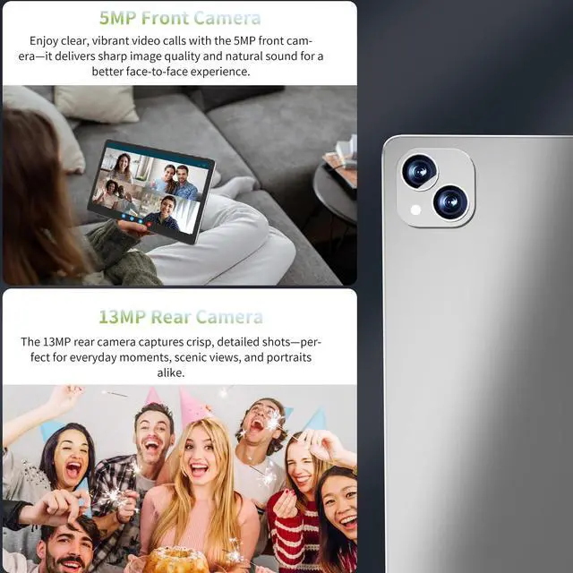 Enjoy fast dual-band 2.4G /5G Wi-Fi and Bluetooth 5.0 for smooth streaming, gaming, or video calls. The 1280x800 IPS screen delivers clear, vibrant visualsperfect for home, work, or on the go. ^^ 20GB RAM + 128GB ROM + 2TB Expandable Comes with 20GB RAM (6GB built-in + 14GB expansion), 128GB ROM, and supports TF cards up to 2TB. Plenty of space for apps, videos, and files. Enjoy smooth switching between tasks wherever you are. ^^ 5+13MP Dual Cameras + GMS Certified 5MP front and 13MP rear cameras capture clear photos and videos.