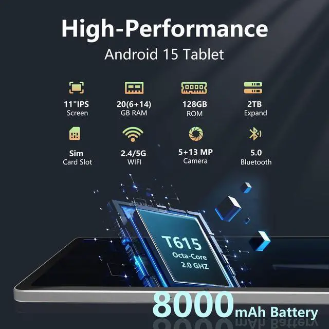 Latest Android 15 Tablet + Powerful Octa-Core ProcessorExperience speed like never before! This 11" tablet runs on Android 15 and a fast 2.0GH z T616 octa-core processor, offering 30% faster app launches and smoother multitasking than Android 14. Smarter privacy and permission controls ensure a safer, seamless experiencegreat for gaming, streaming, or everyday use for users of all ages. ^^ 4G LTE SIM, Wi-Fi 2.4G /5G + Bluetooth 5.0S tay connected anywhere with this 11" tablet featuring separate slots for a 4G LTE SIM card and a microSD card (cards not included).