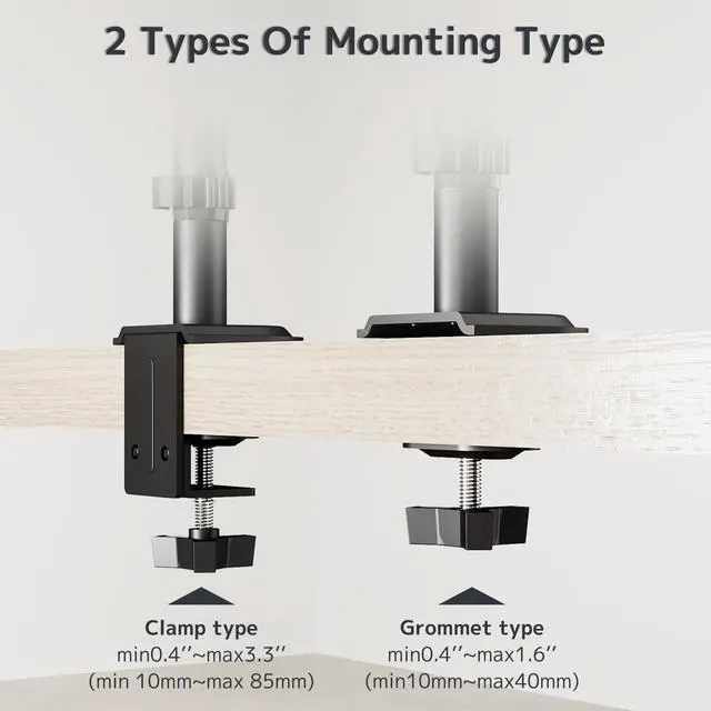 installation methods: clamp and screw (grommet) fixation. Each method can accommodate desk thicknesses ranging from 0.4 inches to 3.3 inches and 0.4 inches to 1.6 inches, respectively ^^