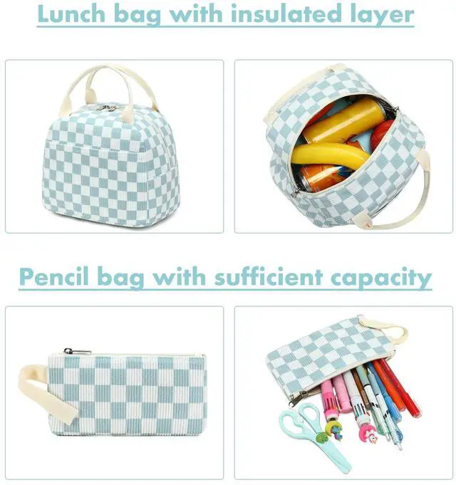 Multifunctional Lunch Tote Bag size: 10"x7"x8" (L*D*H), can fit 2*700ml lunch box together with some fruits and soda can. Insulated inside help keep your food fresh, convenient for daily use and can put phone, purse, card. Also well used as tote bag for girls to go shopping, travelling, dating, etc ^^ The girls backpack with lunch box set also come with a pencil case, 8x4L*H), suitable for standard size pencil/ 7.5"L. It can also used as clutch pouch, purse or wallet, to fit keys, cards, suitable for school girls daily use or travel ^^ BLUBOON backpack is beyond cute, stylish and extremely durable. Padded and adjustable straps help girls to ease the pressure on shoulder. Perfect used for school, office, working, shopping, dating, travelling, camping and etc