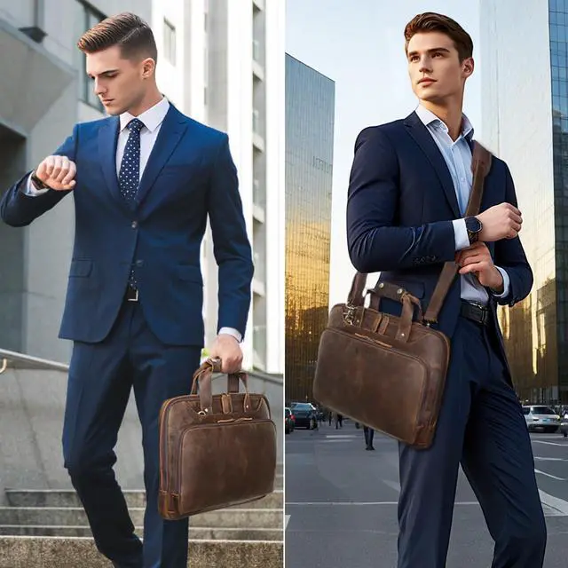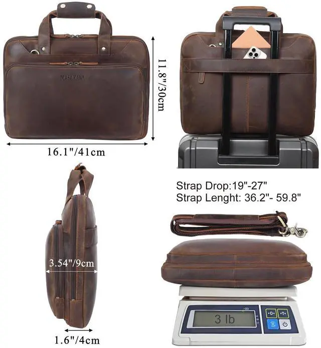 Versatile UsageThe mens leather briefcase has a luggage sleeve to attach to roller suitcase for easy travel. It has a detachable adjustable shoulder strap for multi carrying ways as handbag, cross body messenger bag, or shoulder bag. Its good for business trip, meeting, customer visits, daily commute for lawyer, businessmen, office clerk to built confident image. Good gift for Valentines day, fathers day, graduation, birthday, Christmas, new year. ^^ Full Protection Laptop Bag The slim leather laptop briefcase is designed to fit most of 15" - 16" laptops.