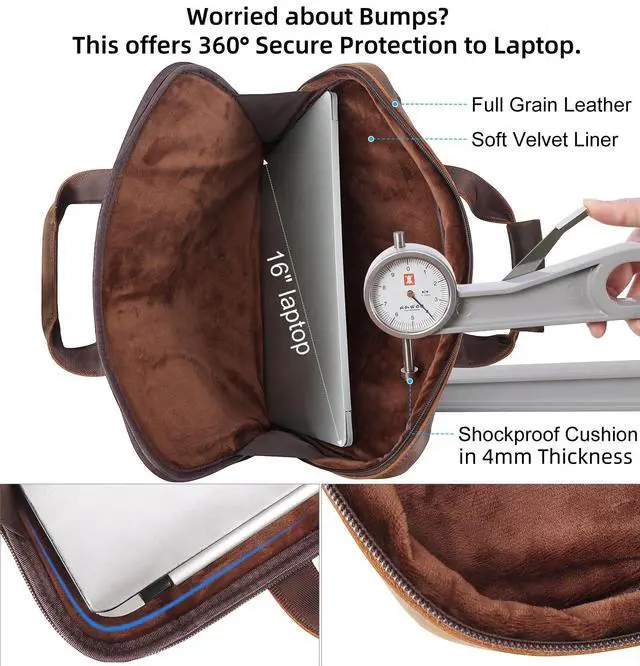 It offers full edge protection with 3 layers cushion in thickness of 4mm, protecting your cherished laptop and tablet's edges and screen from potential damage by accidental bumps and falls. Velvet liner is soft, smooth and friendly to your electronics. ^^ Sturdy BriefcaseThe leather laptop sleeve case is created to last over 10 years. Its crafted of premium 1.8 mm thick full grain leather, ykk zippers which can bear 1000 times pulls, customized sturdy heavy duty metal hooks, tight stitches crafted by skilled artisans. Its leather is unique with natural leather pattern, and gets patina with age and use.