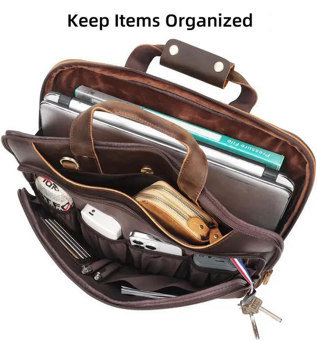 Its a bag can pass to next generation and a companion witnesses your life and success! ^^ Organized Slim BriefcaseThe brown leather briefcase is slim but has multi pockets to keep items in order. 1 front zip pocket with 4 card slots, 2 pen loops, 1 detachable key hook, 5 inner pouches for glasses case, power bank, mouse, passport, cords; 1 front and 1 back pocket with magnetic snap for notebooks; 1x 360 protective compartment for laptop, tablet, A4 magazines; 1 back concealed zip pocket under luggage strap for mobile phone to anti theft.