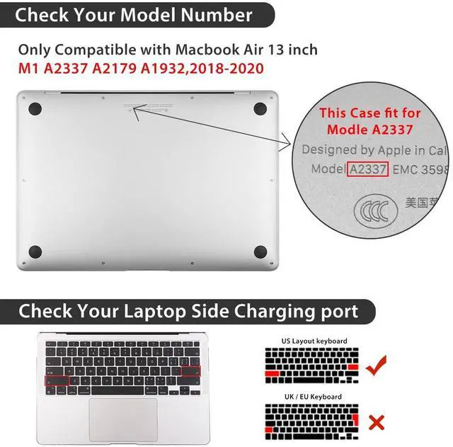 • Check your modelOnly compatible with New MacBook Air 13 inch case 2018-2022 release with Touch ID&Retina Display (Models: M1 A2337 A2179 A1932) NOT compatible with Older MacBook Air 13 (Model: A1369 A1466, released between 2010-2017), Please kindly check the model number at the bottom of your laptopA****)