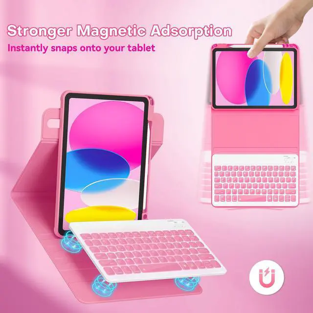 Generation 2022(Model Number: A2696/A2757/A2777/A3162). Please check the model number starting with "AXXXX" on the back of your iPad before purchasing. (This product does not include: Tablets & Pencils! ) ^^ 7 Colors Rainbow Backlight KeyboardThe RGB rainbow backlight keyboard for iPad A16 11th generation can provide you with a typing experience in the dark, and the backlight has 7 adjustable colors. These colors can be automatically switched in breathing light mode, and the brightness of the keyboard can be adjusted by pressing Fn+light key. When you don't need the backlight, you can turn it off. ^^ Long-Lasting Battery Life Rechargeable KeyboardThis for iPad a16 keyboard case has a built-in 420 mAh lithium battery, which charges for 2-3 hours and can work continuously for up to 60+ hours under normal use, which will automatically enter sleep mode when not used for a long time to save power, and click any key to instantly the wake-up. Standby state lasts up to 150+ days, which is very friendly for travel and mobile office. ^^ 360 Rotatable Strong Magnetic AdsorptionThis protective for ipad 11th generation keyboard case is made of premium PU leather and has 16 built-in powerful magnets, which can firmly absorb the keyboard to prevent the keyboard from moving and falling. The back cover can be rotated 360 degrees, The tablet can be placed horizontally or vertically, or it can be detached for use, allowing you to watch videos or read at a comfortable angle.
