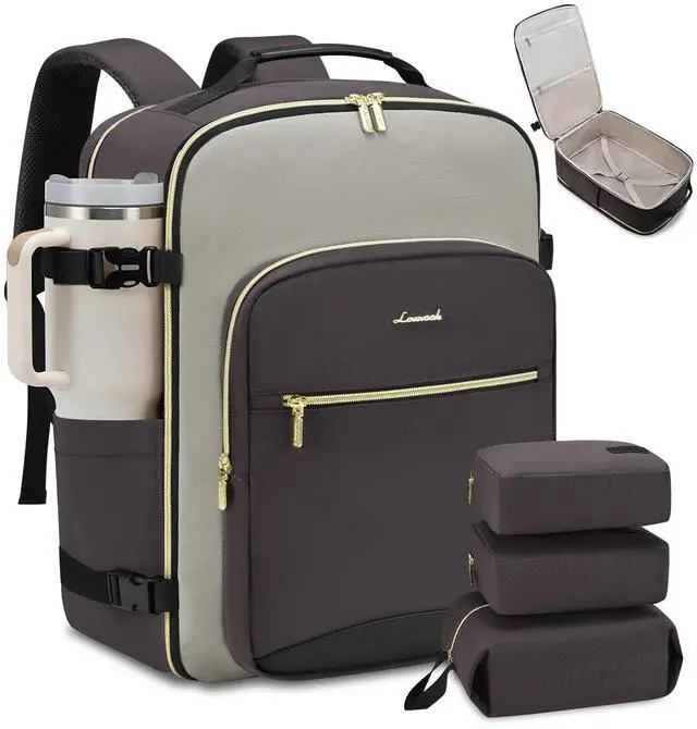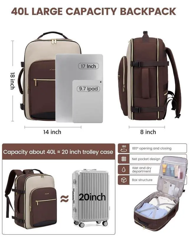 Versatile & Airline ApprovedMeasuring 18*14*8 inches, this carry on backpack fits under the seat or in the overhead compartment, approved by Spirit, Frontier, JetBlue, and other budget-friendly airlines, making it the perfect personal item for air travel. ^^ Spacious & OrganizedWith a 40L capacity, 4 compartments, and a lot of pockets, this travel backpack offers ample space to organize clothing, accessories, and daily essentials, helping keep items separated and easy to access. ^^ 3 Extra Packing Cubes & Wet PocketsThis carry-on bag includes 3 extra packing cubes 2 storage bags and a shoe bag as well as a built-in wet compartment pocket.