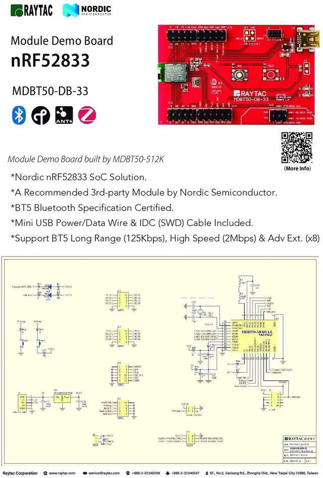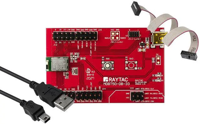 Raytacs MDBT50-DB Module demo board Dev Kit deployed Raytac MDBT50 series module (MDBT50-512K or MDBT50-P512K) is a BT 5.2 stack (Bluetooth low energy or BLE) module designed based on Nordic nRF52833 SoC solution, which
