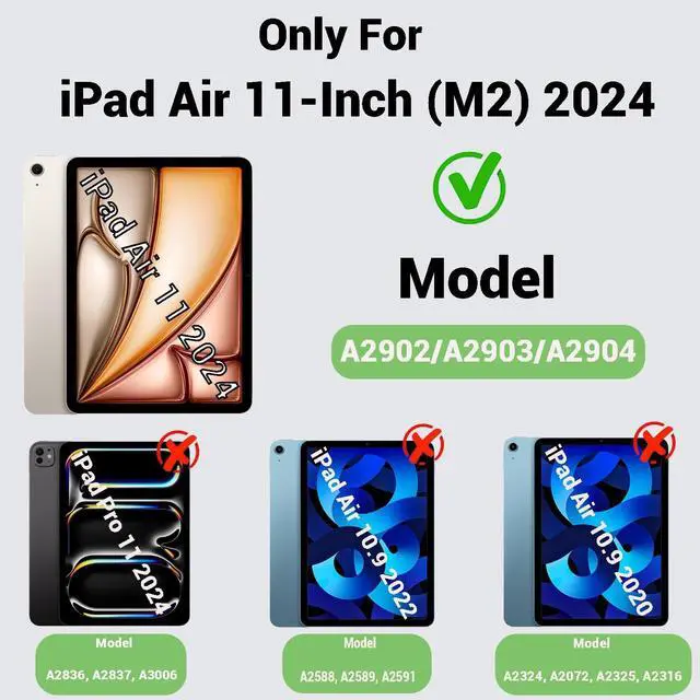 Release(Model Number: A3266/A3267, A3270, A2902, A2903, A2904). Not Compatible with iPad Air old version. Please confirm your tablet model before purchase. Not included the pencil. ^^ Full-Body Protection + Screen ProtectoriPad Air 11 inch case is made of 3 layer structure: shock absorbing rubber bumpers outer shell, high quality PC and hard front frame built in a screen protector. Better protection it prevents for your tablet from accidental drops, scratches, bumps and shock. ^^ 360 Rotatable Kickstand + Hand StrapiPad Air 11 M3/M2 case built in 360 degree rotatating kickstand provide you more angles for typing, reading, watching video, playing game ect. The handheld velcro strap on the back is perfect for using the tablet and keeping it steady while moving around. Ideal for conference, class, engineer outdoor operation ect. ^^ Adjustable and Removable Shoulder +Pencil HolderThe ajustabale shoulder strap can free your hand and use it as a neck strap which is perfect for working, hiking, traveling and other outdoor activities ect. The pencil holder supports wireless charging and magnetic attachment, giving a secure and convenient storage for your S Pen. (Not included the Stylus Pen) ^^ Easily AccessibleVery easy to install your tablet in and out. iPad Air 11 case 2025/2024 fits your tablet perfectly, without worrying about accessing to all ports, buttons and controls. Whmeolyo provide quality assurance, please contact us if your order have any problems.