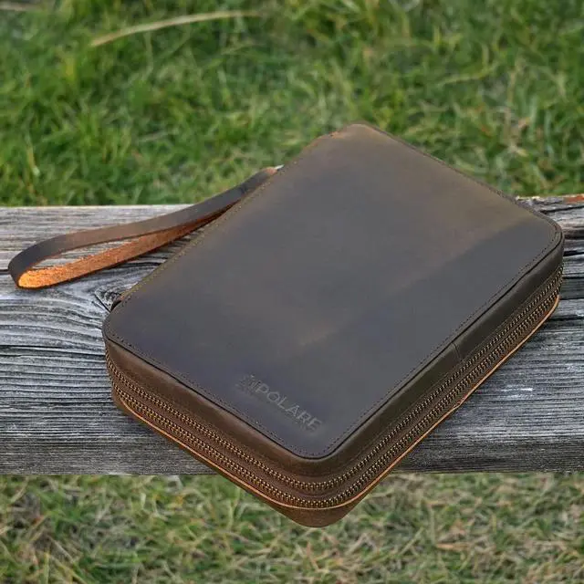 Handcrafted by Artisans - Made with thick full grain Italian leather and premium YKK zippers, has a smooth, soft and luxurious feeling in your hand. 180 degree fully opening, convenient and quick access to your electronic accessories. (No include cords, electronic accessories) ^^ Dimensions - 6.7 (L) * 2.36 (W) * 8.75 (H) inches.