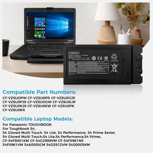 Battery AdvantagesMore than 1000+ recharge cycles over the life of the battery; All of the products are Certified by CE, FCC, RoHS and UL for safety; Better circuit board, multiple command chip control, keep the battery stable charge and discharge. Over charger and discharger protection, ensure fast charges and low power consumption ^^ Compatible Laptop Modelsfor Panasonic TOUGHBOOK, For Toughbook 54, 54 Gloved Multi Touch, 54 Lite, 54 Performance, 54 Prime Series 54 Gloved Multi Touch, 54 Lite, 54 Performance, 54 Prime, CF-54F9001KM CF-54G2999VM CF-54F0961NE 54F0961VM 54A0005CM 54D2912VM 54D0005KM ^^ Specification of the