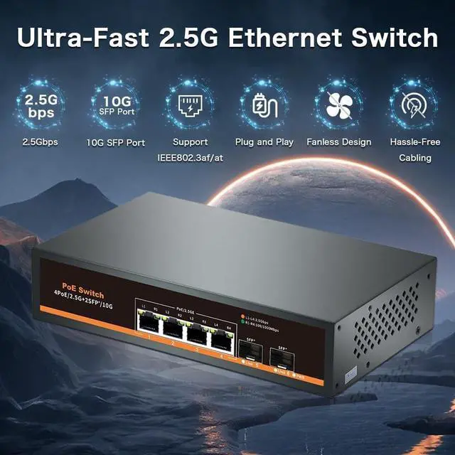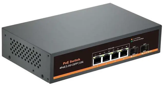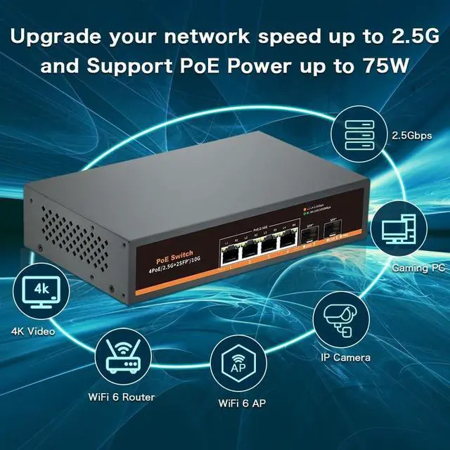 PoE Switch: Including 4* 2.5G PoE+ Ports and 2*10G SFP Uplink Port, compatible with 100/1000/2500Mbps, the 2.5G power over ethernet switch can transmit network data and power at the same time with IEEE 802.3 af/at standard. You can connect it to all your devices, such as Gaming Computer, Laptop, routers, IP camera, IP phone, NVRs, 4K video, 2.5G WiFi 6 AP, 2.5G NAS etc.