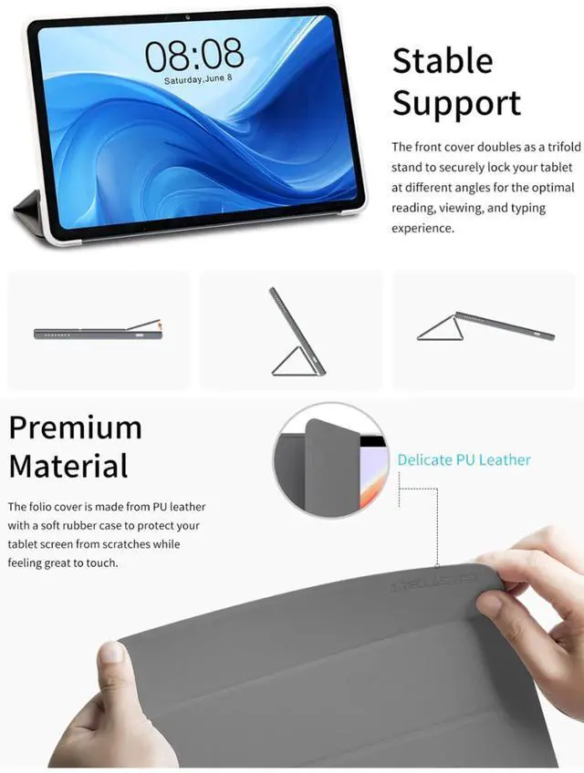 Designed exclusively for TECLAST T60 Tablet 12 inch Android 14 Tablets. NOT compatible with TECLAST T50 or other tablet models ^^ [Full Protection] This TECLAST T60 Tablet Case is made of durable silky PU leather and TPU, front and back covered by soft PU, the inside back shell TPU can fix your TECLAST T60 and protect its back coverm and four corners, maximum protect your TECLAST T60 from drop and scratch, the surface is soft and silky to provide a comfortable touch to the skin ^^ [Auto Sleep Wake] - The smart magnetic case supports auto sleep function.