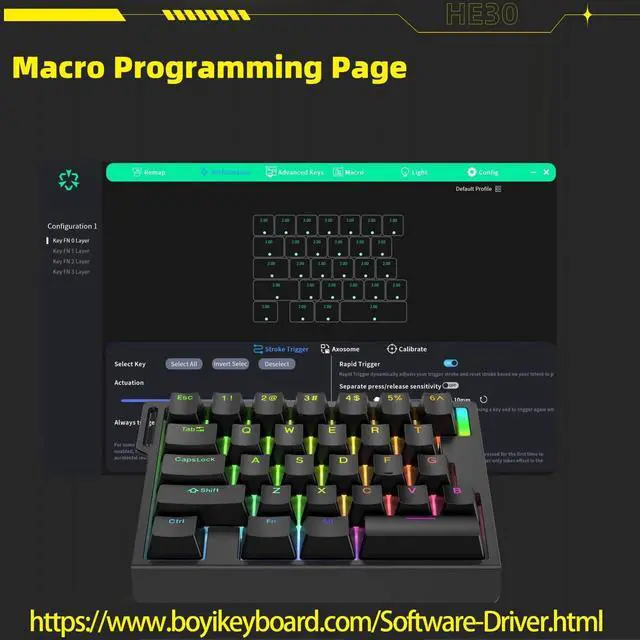 Software Wired Keyboard: 29-key compact layout saves 60% desk space with left/right hand configurability. Pro Software support Macro programming, key mapping, multi-profile storage, one-click gaming/office mode switching ^^ Rapid Trigger & Dynamic Keystrokes Keyboard: Adoption of flexible reset point, keys reset hyper-fast response with an upward motion as low as 0.1 mm. Dynamic Keystrokes, program up to 4 different commands in the same key, easily implement a variety of gameplay combos and moves, bringing you better combat power in fast-paced games ^^ Adjustable Dedicated