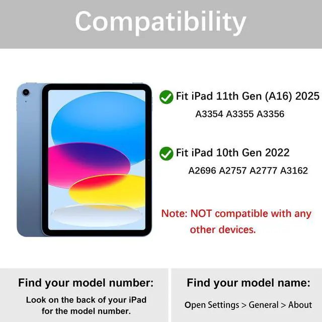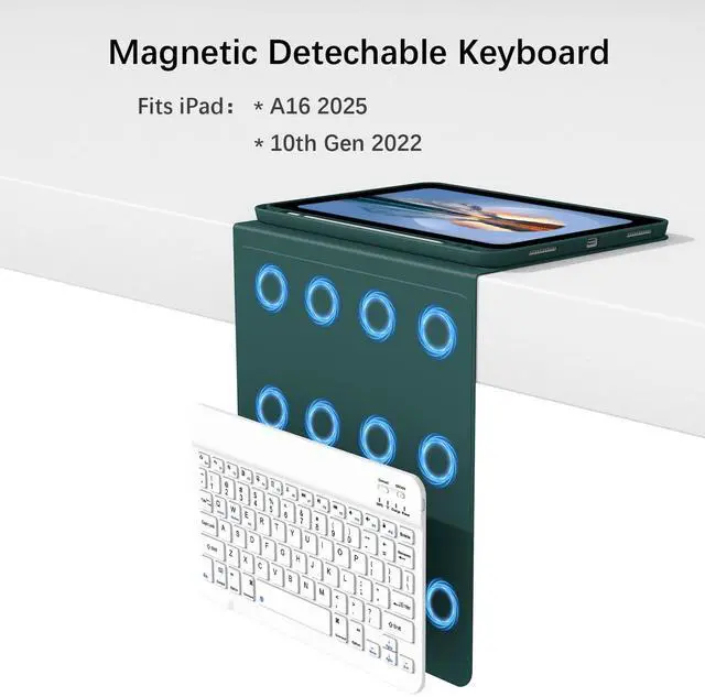 Compatibility- Protective case for Apple iPad (A16 2025) and iPad 10th Gen 2022 released. NOT compatible with any other devices. NO pen in package. ^^ Support 3 System&Full Shortcut Keys- The magnetic wireless keyboard can be removed from the case freely. Compatible with iOS, Android, Windows. Just press Fn and corresponding keys (QWE) to change the keyboard system. Hot keys Customized for iPads, Full Shortcut Keys give you a more efficient way to use your keyboard. ^^ Long Life Battery&Rechargeable Slim Bluetooth Wireless Keyboard&Instant pairing- 2-3 hours full charge, work for more than 80 hours, stand by for 130 days.