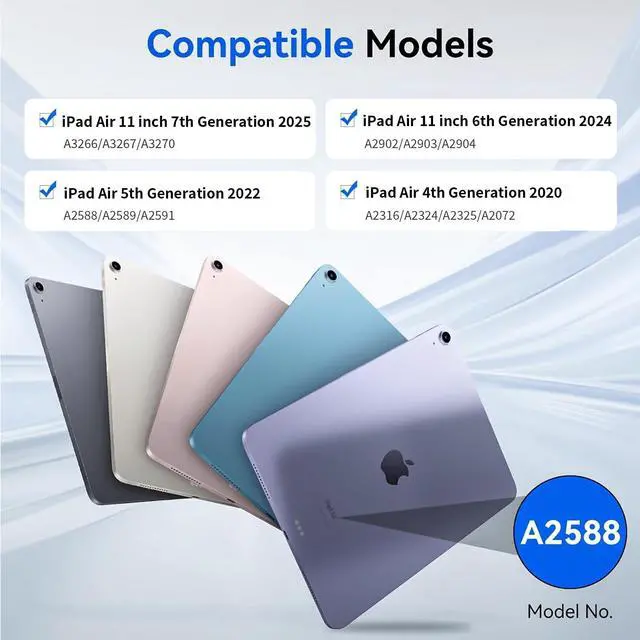 Compatibility : Specifically designed for the iPad Air 11 Inch M3 2025 (Model: A3266, A3267, A3270), iPad Air 11 Inch M2 2024 (Model: A2902, A2903, A2904), iPad Air 5th Gen 10.9 inch 2022 (Model: A2588, A2589, A2591), iPad Air 4th Gen 10.9 inch 2020 (Model: A2072, A2316, A2324, A2325). NOT compatible with any other devices. Please verify your iPad's model number located on the back of the device before purchasing