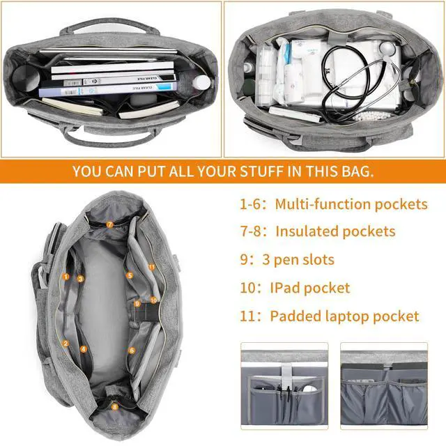 Professional medical nurse bag: multi pockets to store gauze, tourniquet or anything you want. 3 slots for pen, thermometer, tuning forks and etc; 2 insulated pockets help keep food drinks' temperature ( hamburger, hot coffee or cold cola) when you busy or for sanitizer, bottles, umbrella, etc.