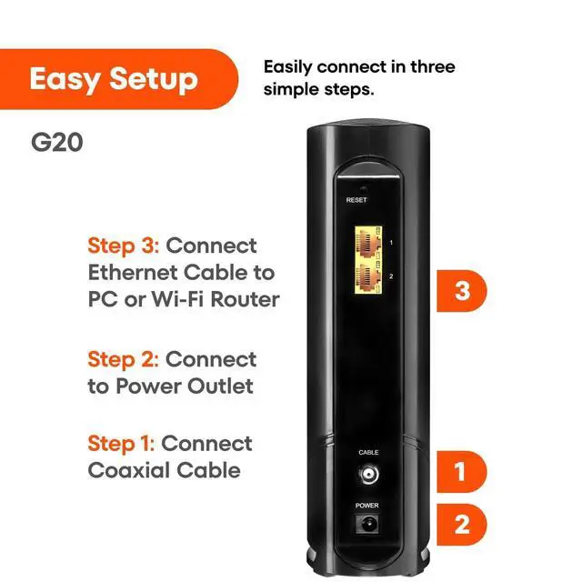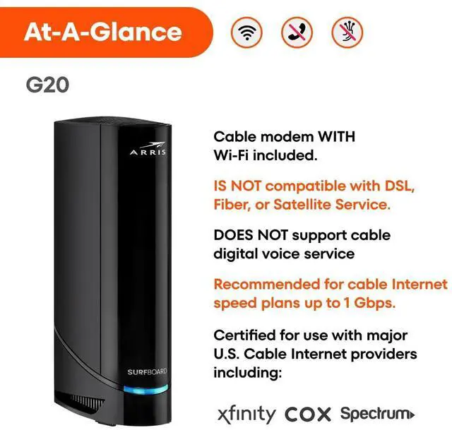 The SURFboard G20 DOCSIS 3.1 Wi-Fi 6 cable modem uses the latest technology to deliver faster download and upload speeds, all in a single device. The DOCSIS 3.1 functionality supports gig-speed cable internet plans. Powered by Wi-Fi 6 ( 802.11 ax) technology on every radio, the SURFboard G20 delivers faster Wi-Fi speeds and greater range than the previous generation of Wi-Fi. Plus, with next-generation upload speed optimization, the G20 can achieve upstream speeds up to 450 Mbps, enabling worry-free video conferencing and ultra-fast data uploads.