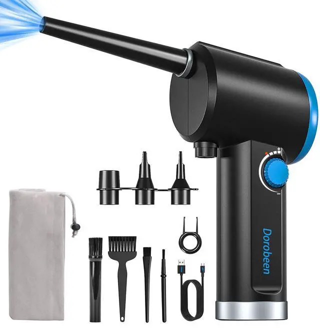 Compressed Air Duster - Innovative stepless speed regulation. The wind power can be adjusted freely by rotating the knob, which is easy to use. Makes the cordless air duster versatile. ^^ Air Duster - 6000mAh Rechargeable Air Duster. A full charge can be used continuously for 18-30 minutes. Satisfies many daily cleanings. An environmentally friendly alternative to compressed air can. ^^ Air Duster Compressed Air - High quality compressed air dustr from DOROBEEN manufacture. A brushless DC motor (BLDC) is used. It has more torque, RPM control, higher RPM, lower maintenance, lower wattage, and slightly quieter.