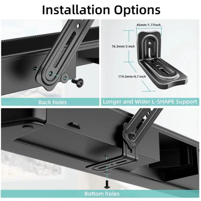 ^^ Flexible Mounting OptionsThe detachable long extension plates provide up to 180 swivel, offering more flexibility than traditional fixed brackets. This design allows you to position your soundbar above or below your TV, perfect for various room layouts and corner installations. ^^ Effortless InstallationInstalling your soundbar is simple and quick with the included hardware and easy-to-follow instructions. The teeth on the arm connections securely lock your soundbar in place, ensuring a firm hold without additional wall drilling, making installation a breeze. ^^ Customer Support & WarrantyEnjoy peace of mind with our US-based customer support team, ready to assist you with any pre-purchase or installation questions.