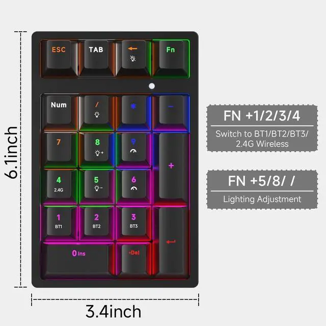 Wireless Numeric Keyboard, Mechanical Number Pad with RGB LED Backlit 21 Key Numpad Wireless 2.4G /Bluetooth 5.0 /Wired USB-C RGB Backlit Numeric Keypad Rechargeable Numeric Keypad for Win/Mac