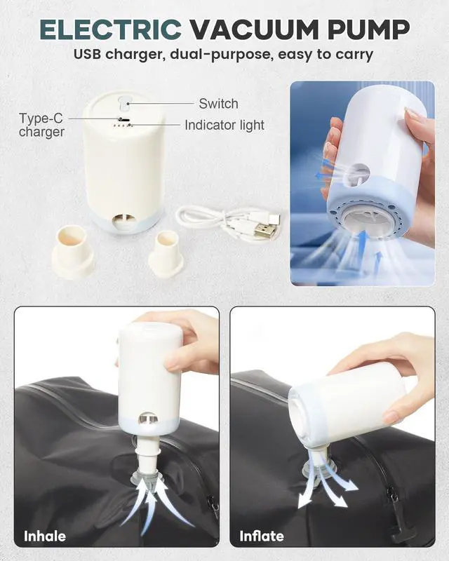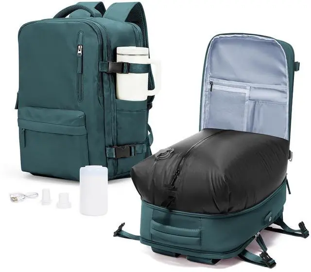 Vacuum Compression System - Innovative vacuum compression technology doubles packing efficiency! Features a vacuum valve supporting both electric pump quick-compression and manual air release, instantly eliminating wasted space while expanding storage capacity for hassle-free travels. ^^ Portable Vacuum Pump - Comes with a compact vacuum pump for on-the-go convenience. Multiple nozzle attachments allow precise air extraction, whether you're quickly compressing clothes or adjusting storage space. ^^ Multi-Functional Design - Meticulously crafted for business trips, workouts, and daily commutes. Features a smart compression system with multi-functional inner pockets in the main compartment, plus a front quick-access pocket for essentials.