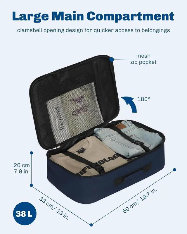 Comfortable to Carry hide-away contoured travel luggage backpack straps are well padded with air mesh, can carry it comfortably as a carry on backpack or also can easy convert it into a weekender duffel bag; provide 3 carrying options for travelers' multiple alternatives; there is a sternum strap that adjusts lengthwise and slides up and down the shoulder straps; 2023 ver. with added back trolley strap fits over most upright handles for seamless, on-the- go-travel. ^^ Functional Compartmentstravel backpack for men women has a large main compartment with tie down straps help to organize your travel essentials; zippered front pocket is perfect for boarding passes and will not "walk open", interior slot pockets for travel belongings, from passport to tablet ^^ Easy to Compress traveling backpack has 4 exterior compression straps are carefully placed to provide maximum compression and reduced stress on the zippers; so if travel with a partially packed bag, you can preventing the contents from sloshing around ^^ Flight Approved Size weekender backpack designed to fit maximum size allowed on the most of flights, available to fit in the overhead compartment and the under seat storage in flight.
