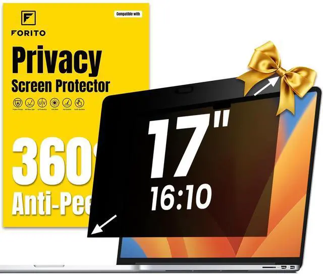 Compatible Model This 17 inch laptop privacy screen is specially compatible with 17" laptops with 16:10 aspect ratio. Please verify your computer screen's length and width measurements before ordering ^^ Upgraded 360 Anti-Peeping Film With its innovative 360 privacy design, F FORITO 17 inch privacy screen for laptop offers unparalleled protection for your personal information. By effectively restricting the viewing angle to only the user in front, it prevents unauthorized individuals from seeing your display from the sides or behind ^^ Prioritize Eye Health This 17 inch computer privacy screen protects your eyes with anti-glare and anti-blue light technology.