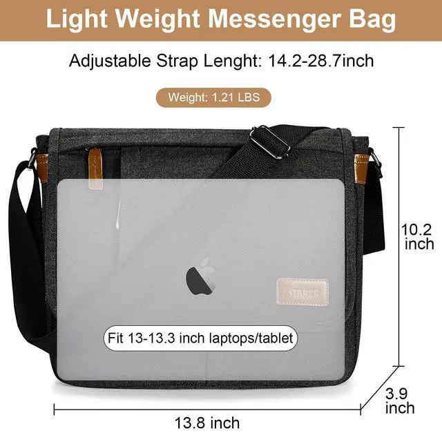 satchel dimensions: 13.8" x 10.2" x 3.9"; Adjustable & Durable strap 14.2 - 28.7; Compatible with MacBook Air/Pro M3/M2/M1 13; Compatible with HP Elitebook 13.3 /Spectre X360 13.3; Compatible with Acer Swift1/3 13.3; Compatible with Dell XPS 13 Laptop/13 Latitude 3330/3340/7340/5340; ^^