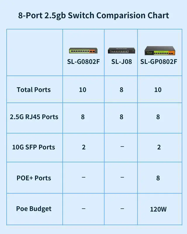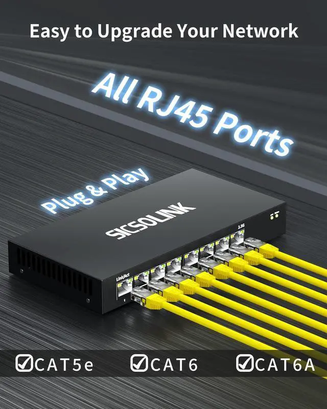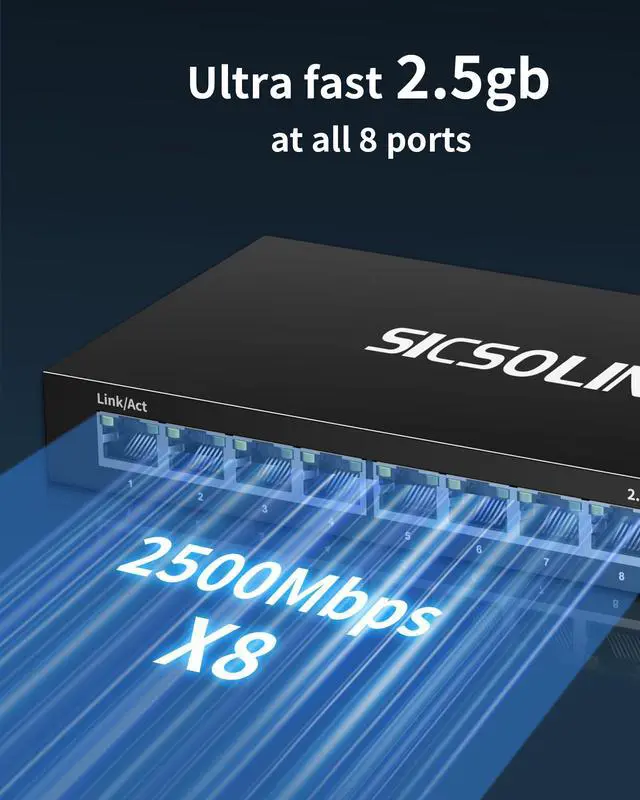 2.5G bps Speed This switch help to get speeds 2.5 x faster than Gigabit for smooth gaming, streaming, and file transfers across many devices ^^ 8 RJ45 Ports for All Connections All eight ports are 2.5G Base-T RJ45 ports. They work with your existing Cat5e cables or better cabling and are compliant with IEEE 802.3 bz ( 2.5G ) and IEEE 802.3 ab (1G) standards. You can easily connect up to 8 devices such as desktop PCs, laptops, workstations, NAS, WiFi access points, and smart TVs. ^^ Easy to usePlug-and-Play, set up takes seconds just plug it in, no software needed no cable changing.