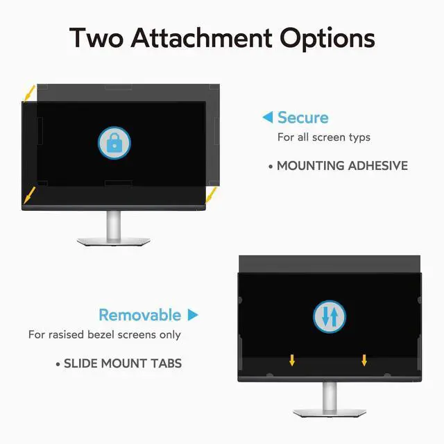 Install & Two Attachment Options: Simple installation, no bubbles, unlike traditional methods. The monitor privacy screen has two uniquely designed installation methods. Fixed installation (for any computer screen): Apply adhesive stickers directly on the screen filter to hold it in place on the monitor screen itself. Removable installation (for raised bezel screens only): Use slide mount tabs that easily stick to the monitor frame. All tools are included in the package
