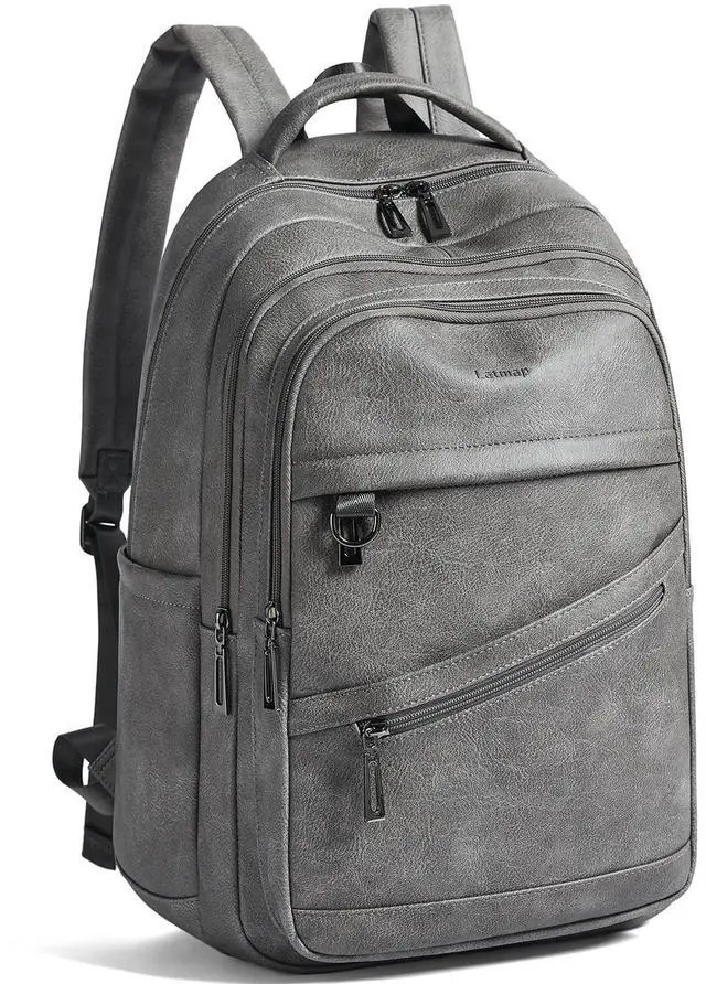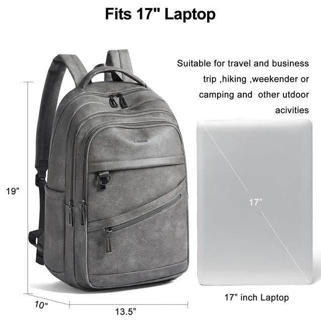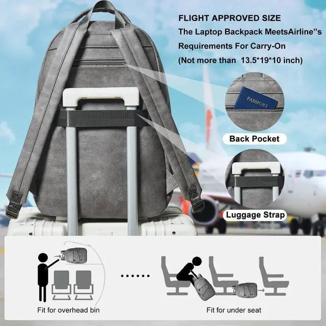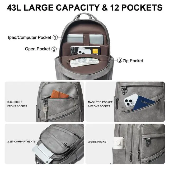Organized Storage: Measuring 13.5" x 10" x 19", this travel backpack for women offers a roomy 43L capacity with 12 functional compartmentsincluding a padded laptop sleeve and side bottle pockets. Whether youre heading to class or packing for a short trip, its the ideal college bookbag or daypack to keep everything organized. ^^ Soft Vegan Leather with