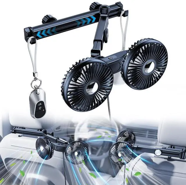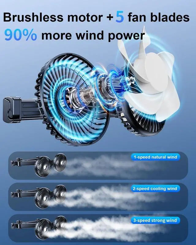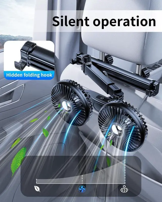 Any Adjustment, Extension ArmThis car fan, besides the part of the fan head can be adjusted 360any way you want, it also has an extra folding extension arm, supports 2-10in extension, and comes with a 2-10in sliding track, which can bring coolness or ventilation to passengers or pets in every corner of the car, either in the front seat or the back seat. ^^ 3 Speeds, Independent ControlThis dual-head car seat fan has 3 speeds, each fan has independent control buttons, which can immediately provide strong air to cool backseat passengers and backseat pets when the car air conditioner is weak or not available at all.