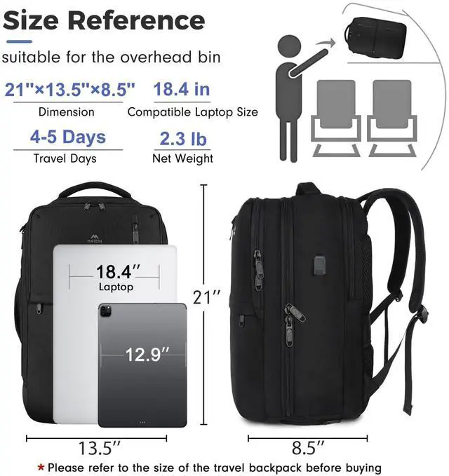 Carry On Airline Approved: Avoid extra luggage fees! Designed at 21H x 13.5L x 8.5W, this carry on backpack for airplanes meets most airlines carry on size requirement, and can be placed in the overhead luggage compartment, suitable for Spirit, Frontier, Easy Jet, Jet Blue, and other airlines. This carry on travel backpack features a TSA-friendly 90-180 opening design lets you breeze through security checks and keep other items tidy ^^
