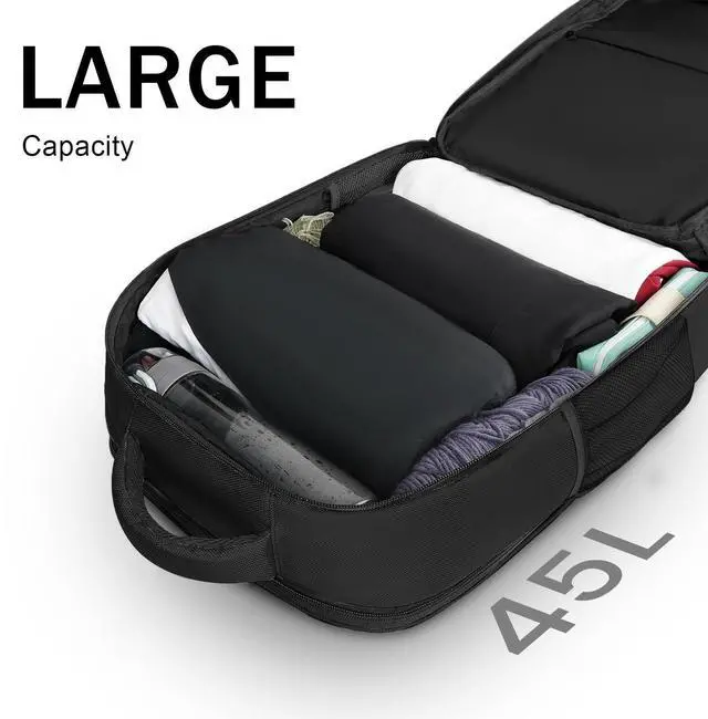 Spacious & Organized: Everything in its place! This large 45L carry on backpack stay organized with 4 main compartments, the travel backpack carry on's main compartment with double zippers has enough storage room to store like a suitcase, fits up to 3-4 days trip. The separate laptop compartment offers enhanced padding to protect your 18" laptop. The front compartment has many pockets to keep your belongings organized. The Secure hidden pocket design can protect your passport, wallet & valuables ^^