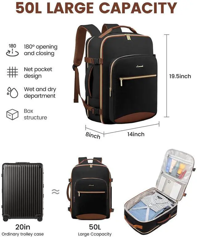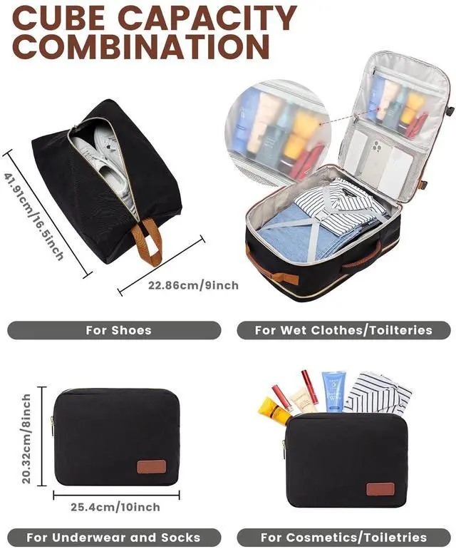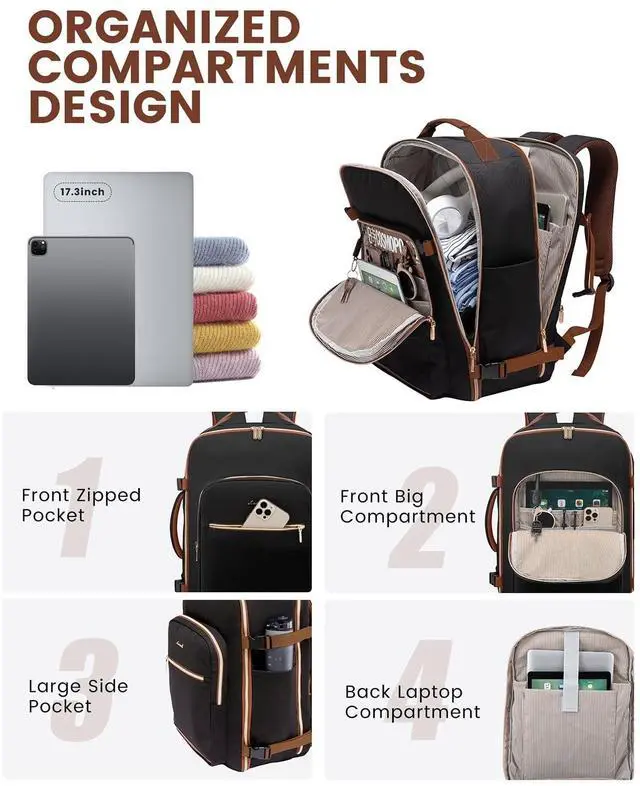 50L LARGE CAPACITYOur travel backpacks enable you to pack all your travel essentials for a 7-9 day travel, which can hold 3-7 days' clothing, a pair of shoes, your wallets, toiletries, a 17.3 '' laptop, a 12.9 '' iPad and so on. The side straps can also help you compress the pack when it is too full. ^^ WELL-DESIGNED COMPARTMENTSThis travel backpack has 4 main compartments and 3 packing cubes supplied, which enable you to keep your things in order. Your shoes, toiletries, and underwear can be placed in separate packing cubes.