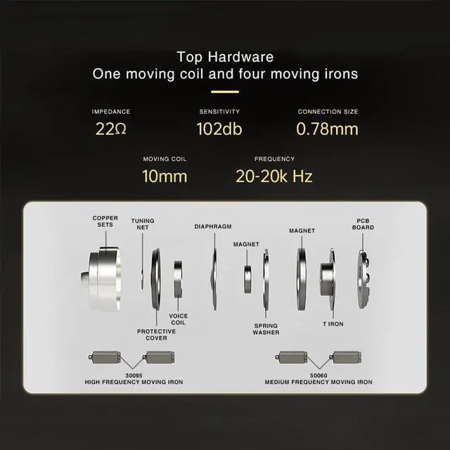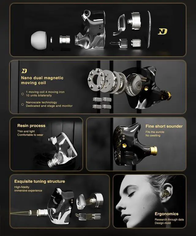Upgraded 4BA+1DD Hybrid Earphones The ND 001 in ear monitors are equipped with two 50060 mid-frequency drivers and two 30095 high-frequency drivers. Combining the precision of the high-frequency balanced armature 30095 and the warmth of the mid-frequency balanced armature 50060, this earphone showcases the all-encompassing charm of audio. The 30095 captures intricate high-frequency details, while the 50060 delivers emotionally rich mid-tones, creating an immersive auditory experience. ^^ Double Magnetic Dynamic UnitThe ND 001 in ear headphones feature an upgraded dual magnetic dynamic design. Through precise magnetic field interaction, it delivers an extended frequency response and exceptional audio separation, capturing every nuance of your music.