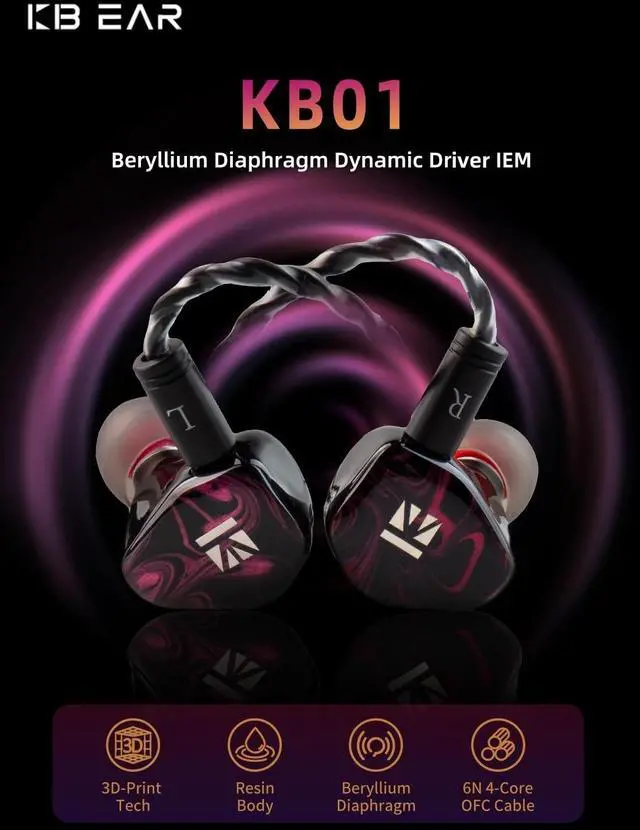 Beryllium Diaphragm Dynamic Driver IEM in ear MonitorsIts time for inears wired earbuds with unclear sound quality to step aside. KBEAR KB01 iem earphones gaming equipped with 1DD 10MM Beryllium Diaphragm Dynamic Drivers (always used for Hi-end level gaming headphones), The sound is balanced, clear, and well analyzed, let you find more details and pleasures from music. ^^ 3D-Printing Technology, Small Cavity with ResinThe housing of each kbear KB01 inear earphones is precisely 3D-printed using resin, elegant and unique appearance, smooth cavity and small earbuds' body, lightweight (only 4 grams single earbuds), which ensures safety to the skin and comfort over many hours of listening.