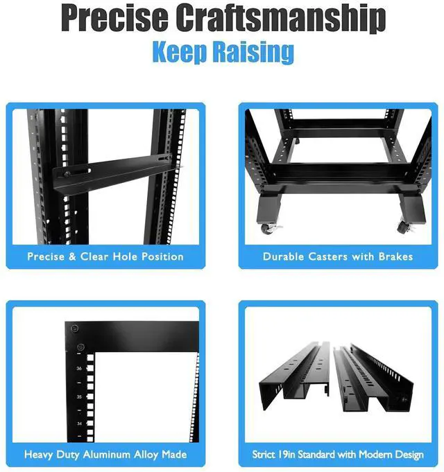 Raising Electronics Open Racks - Solid, Versatile, and Premium Quality Made; Organize and Secure your Rack Mount Equipment. This premium quality 4 post open rack is designed to accommodate different installations for equipment from different manufactures. The adjustable depth up to 17" post to post is a great feature that will fit most of the server installation on the market. This rack is made of 5MM SPCC Cold Rolled Steel to provide you with a maximum load of 700LB. With the heavy duty materiel, it provides your with exception stability. Flat packed for easy shipping and require some assembly.
