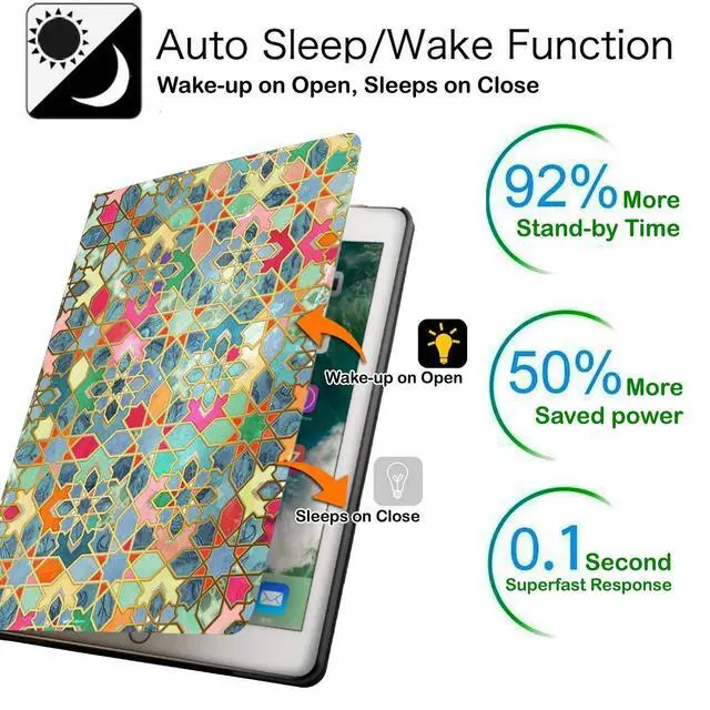 High Quality Lightweight Material & Excellent design makes this case feel very Stylish & Premium & Fully Protects your device against Shock, Abrasion, Scratch, Fingerprint, Slips, Dirt & Corner Damages. ^^ Viewing Angle -> Built-in Viewing Angle Stand makes it much more comfortable for Typing, watching videos, surfing web & reading while keeping both your Hands Free & avoids any Joint Pain. Allows unobstructed gesture swipes & enhances the beauty of your iPad due to its exclusive Bezel-Free design. Built-in Magnet also helps to hold your iPad steady while using the Dual-Angle Stand feature & prevents your iPad from falling.