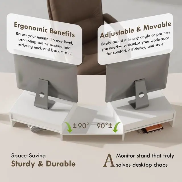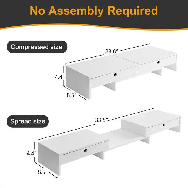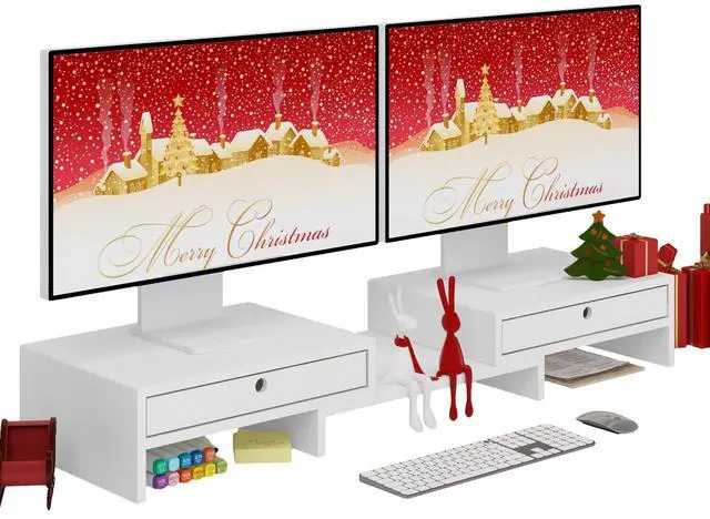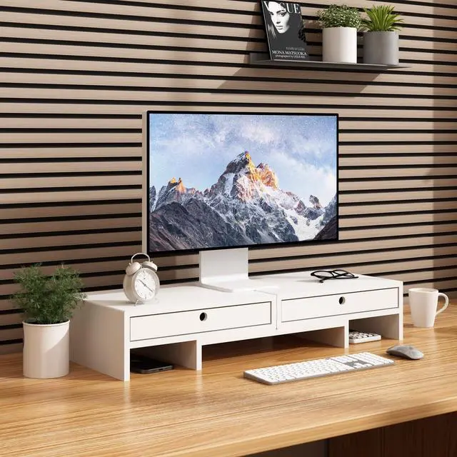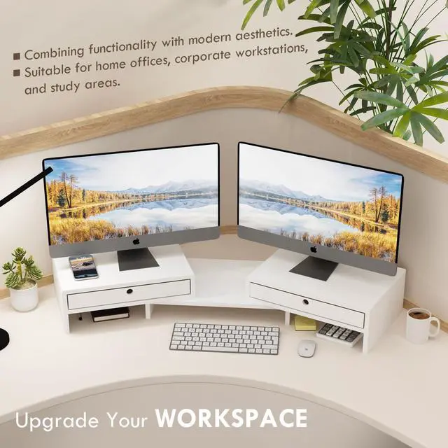 ^^ Useful & Orderly: The monitor stand can hold 2 monitors! It may be an ideal choice when you need multiple computers to work together. With 3 storage spaces under the monitor stand, plus 2 drawers, you can organize some office supplies and keep your desk in order.