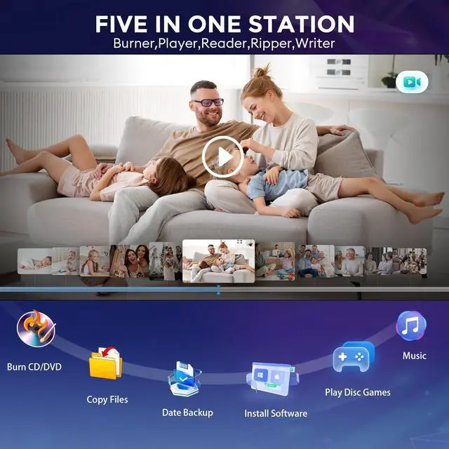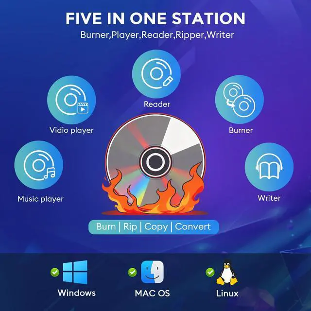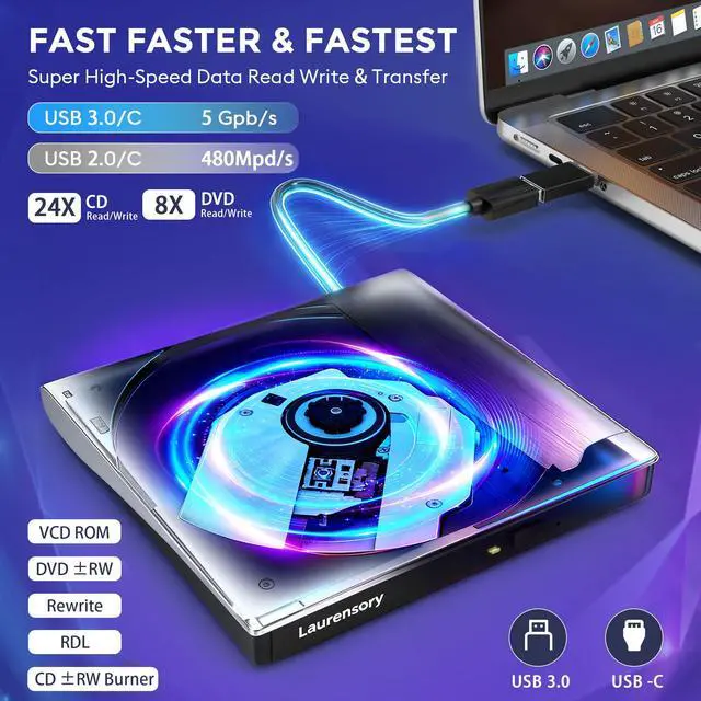 Portable CD/DVD Burner & Player - This external cd/dvd drive can be a CD/DVD burner, writer, player, reader, or ripper. Use this disk drive to play or burn music or movies, back up, store or transfer all files or material you wanted, like copying photos, reading X-ray on disk, or ripping some DVDs to your Apple MacBook Air. Also use this cd reader for laptop to download and install games or any other programs. ^^ Wide Compatibility - This plug-and-play external cd drive for mac is compatible with many OS systems and laptop models.