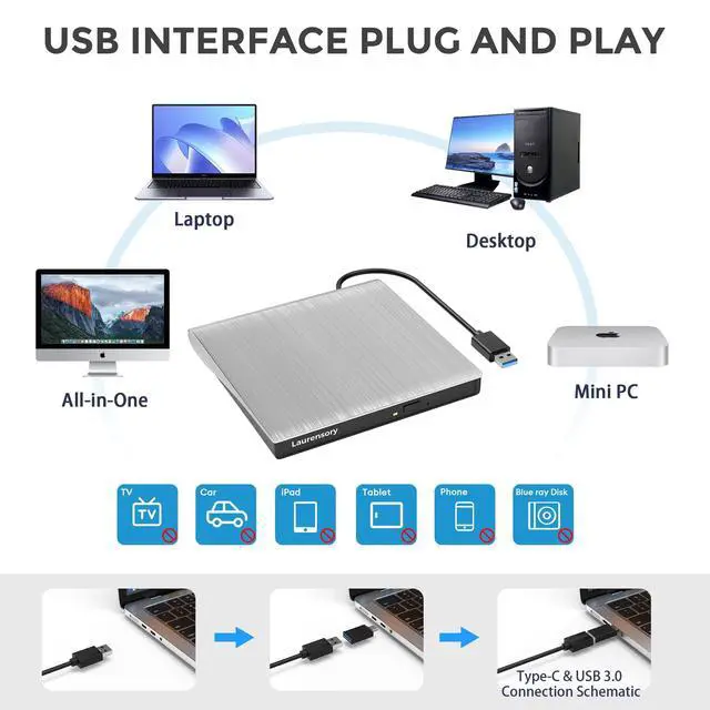 Plug this usb dvd player/cd dvd burner into your USB port, your laptop wwil recognize it without stuttering and noise nor jammed discs. ^^ Well-Designed - This compact and light external cd/dvd drive for laptop is solid enough to be durable and to hold its own weight down while it is spinning discs. With anti-skid rubber on the bottom, brushed texture shell, embedded usb cable slot, dual USB-A and USB-C connector, this cd reader for laptop/cd dvd burner can be easily carried and used anytime anywhere, no matter in the office, school, at home, or during a trip.