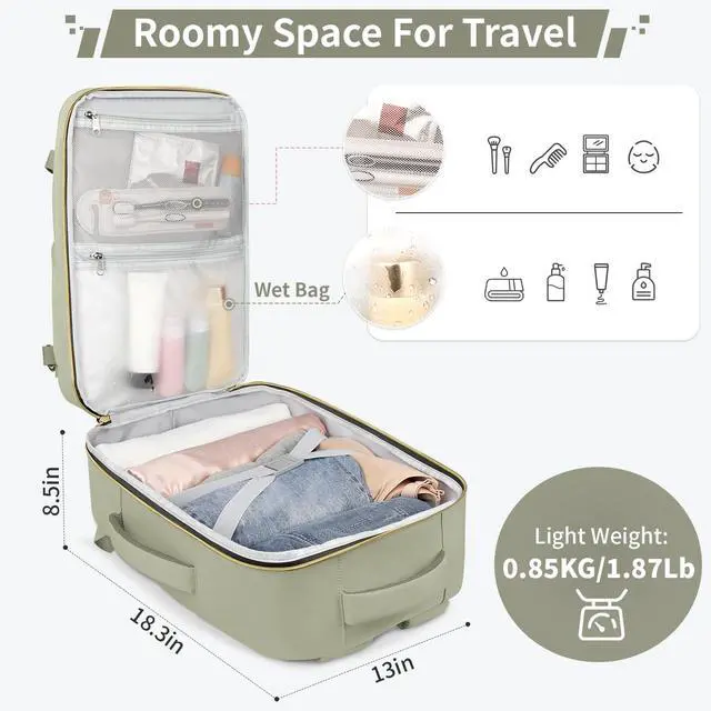 Luggage Backpack Suitcase: This travel backpack carry on offers ultimate versatility and convenience. It features padded, adjustable shoulder straps and padded handles on the top and side, allowing easy transformation from backpack to handbag. The luggage strap design makes this laptop backpack can be setted on your roll-away luggage, offer a flexible carrying experience ^^ Wet Pocket & Breathable Shoulder Straps: The personal item traveling backpack for airplane features a fully high-density waterproof wet pocket can help you to separate wet clothes or towel after stay in a hotel or apartment more convenient. Soft and breathable shoulder straps and back foam help reduce stress on your back while traveling ^^