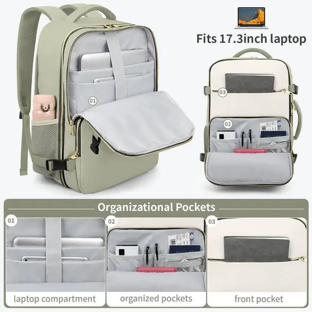 Large Capacity & Multiple Pockets: The travel backpack designed with multi functional pocket for travel necessities. It has main pocket, wet clothes pocket, interior pocket, side pockets, laptop compartment, organized pocket, front pockets 17.3 inch laptop and 12.9 ipad. The built-in elastic bands of main pocket keep your clothes from falling ^^ Versatile Lightweight Carry on