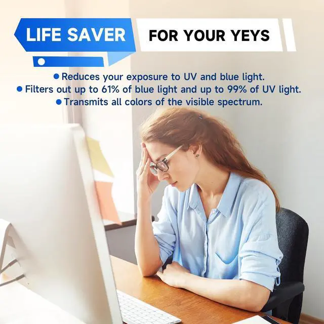 ANTI BLUE LIGHT AND GLAREOur computer screen blue light blocker filters out up to 68% of blue light and up to 99% of UV rays in the 380~460nm range, helping to reduce eye fatigue and related discomfort. It also has an anti-glare function that prevents digital eyestrain and headaches. Whether it is children elderly or pregnant women, students, suitable for most other people. ^^ Eye protection and scratch preventionThe computer anti blue light glare cover 24-inch monitor adopts light filtering optical materials imported from Japan, which can reduce 92% of blue light and 98% of ultraviolet rays, and filter all harmful light emitted by the screen.