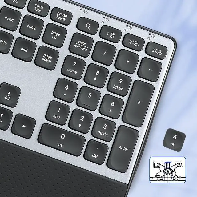 Long Sessions: Built-in soft leather keyboard wrist rest helps prevent fatigue and pain. Ideal for professionals needing a wireless keyboard with wrist rest for daily comfort and productivity. ^^ Quiet Keyboard with