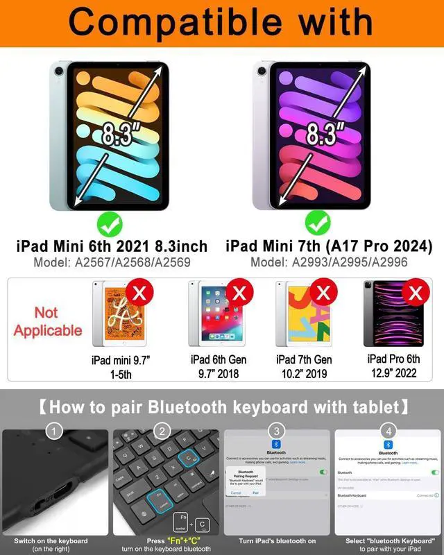 Compatible ModelsThis keyboard case is designed only for iPad mini 7 2024 (A2993/A2995/A2996) / iPad mini 6 2021 (A2567/A2568/A2569). Not suitable for other iPad tablet devices. Please check the model number of "AXXXX" on the back of your iPad before purchasing. (This product does not include: tablet, pencil! ) ^^ How to pair