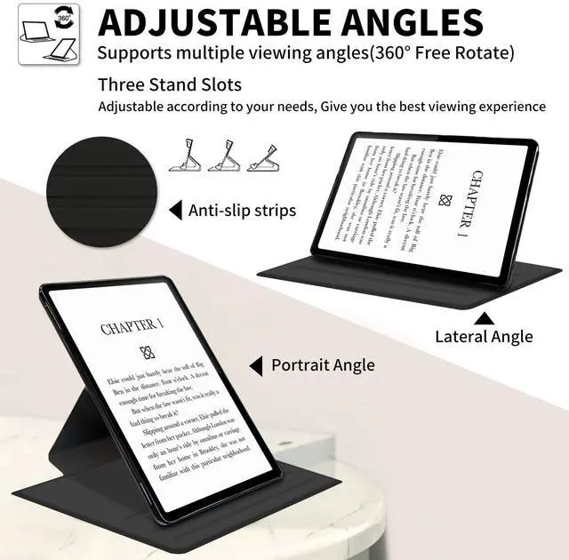 Features: Lightweight portable for working/ traveling Available in a variety of bright and fun colors Premium materials PU leather + stretch esistant TPU 360 Degree Swivel Stand multi-angles viewing adjustable Two anti-slip grooves support 3 flexible viewing positions Quick access to all important features such as buttons, camera, speaker, and ports. Auto Wake/Sleep Boosting your tablet productivity of battery endurance and power saving.