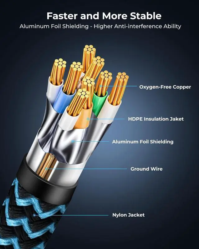 Shielding Interference: The Cat 8 network cable is composed of 4 pairs of shielded twisted bare copper wires that resist external interference. The 50 micron RJ45 connector provides uninterrupted connectivity and less signal loss ^^