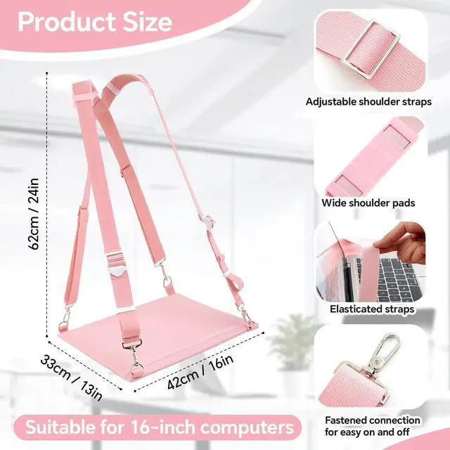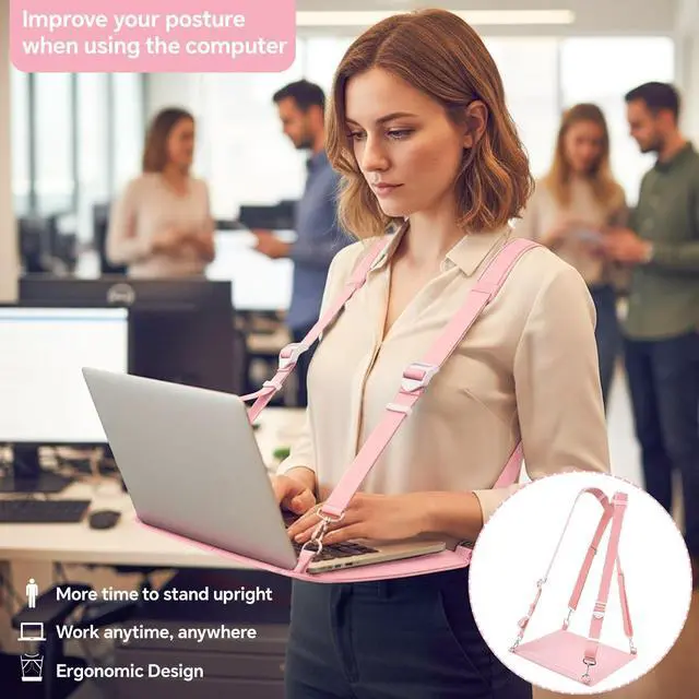 Features: Beyond functionality, this wearable laptop stand boasts a refined aesthetic with its classic pink finish, it seamlessly integrates style with practicality, providing convenience while working. This laptop strap will be a nice gift for workers, allowing them to work in a standing position, improving posture and reducing the effects of sedentary behavior.